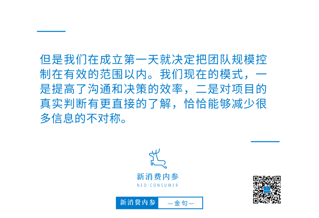 但是我们在成立第一天就决定把团队规模控制在有效的范围以内。我们现在的模式,一是提高了沟通和决策的效率,二是对项目的真实判断有更直接的了解,恰恰能够减少很多信息的不对称。
