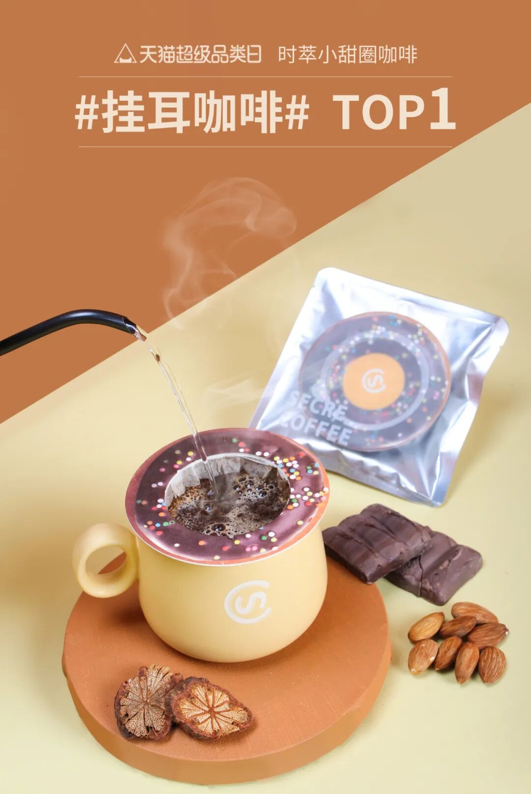 我们现在的两大品类之一——小甜圈挂耳品类,被薇娅等头部主播推荐过多次,是天猫V榜推荐产品,也是天猫挂耳咖啡中月销最多的产品之一,更重要的是它彻底解决了传统挂耳咖啡需要特殊工具和技巧、新手难掌握等缺陷,我们通过甜甜圈形状的环状半球形滤挂设计,增大咖啡水粉接触空间,让萃取更加均匀充分,咖啡小白也可以简单冲出好喝的咖啡,可以说是彻底变革乃至重新定义了挂耳这个品类。