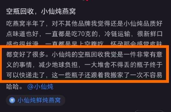 作为连续三年全国销量第一的鲜炖燕窝,小红书上几千篇的晒空瓶笔记,足以表明小仙炖不仅消费用户数量多,且他们长期规律购买;其次,用户用心摆放,用空瓶造型,并分享食用感受,能够感受到他们对小仙炖的喜爱和信赖。而在行业中发起环保活动,这本身就是品牌策划组织能力和企业责任感的体现。