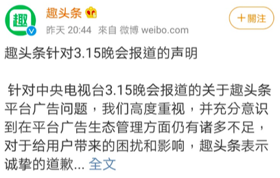 一年一度的315晚会对于许多商家企业来说,简直是比春节晚会都还要受关注。在这一天的夜晚,广大吃瓜群众、网络段子手、同时还有各大公关和品牌经理在社交媒体上汇聚一堂,一边是在品牌账号下抢着抖机灵好能上个热评,另一边则是忙着道歉或是在忙着思考该怎么道歉,当然还有像趣头条这样,节目还没播出就抢着道歉的。