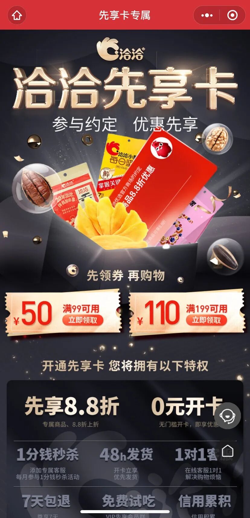 “洽洽微信先享卡”通过约定消费者的消费频次和消费金额,做到有效引流拓客,有效锁客,进一步降低了营销活动的参与门槛,营销投入更为精准,用户消费及拉新也能更高效地完成。