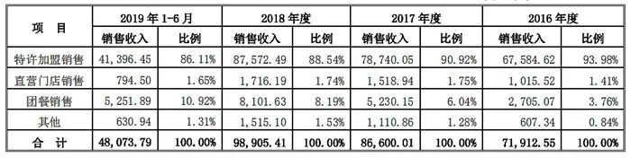 巴比食品招股说明书显示,报告期内其公司主营业务收入分为三部分:特许加盟销售、直营门店销售和团餐销售。其中特许加盟销售稳定发展,占比近90%;团餐的占比则提升迅速,2016年仅为3.76%,2019年上半年占比就超过了10%。