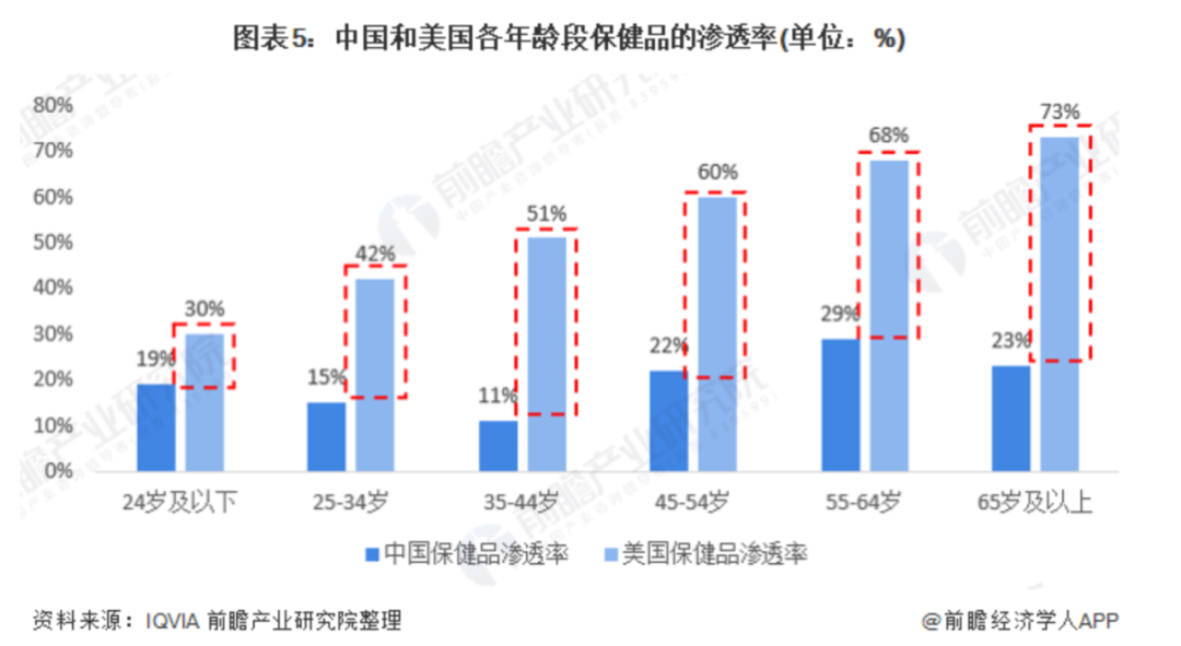 然而与发达国家美国和日本相比,我国的营养健康品在市场集中度及产品渗透率上,仍有很大差距。据Euromonitor,2019年我国营养保健品市场的CR3为14.6%,CR5为19.8%,CR10为28.9%,市场竞争格局分散。这主要因为过去市场监管不够严格,导致大量食品商家进入市场。而在渗透率上,根据IQVIA的数据,我国各年龄段的渗透率在11-29%左右,均远低美国市场的30%-73%。