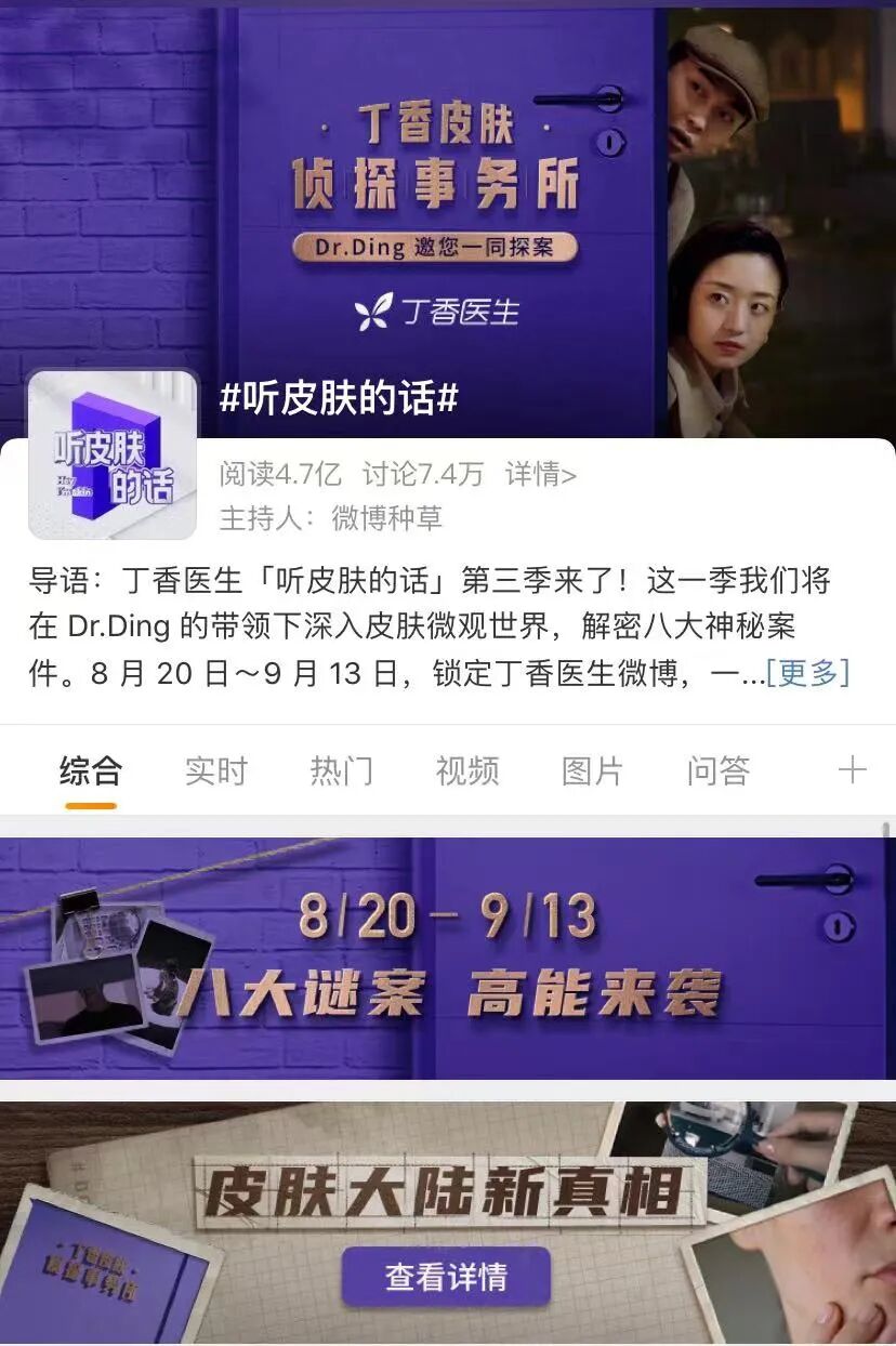 到了第三季,《听皮肤的话》继续迭代升级,不仅以竖屏形式呈现,贴近移动时代短视频观看习惯,还以侦探事务所的悬疑形式来包装,引出皮肤问题和专家破案“剧情”,在3分钟左右的时长之下,实现了悬疑设置、问题搜寻、答案解释和产品推介,不仅形式有所进化,更加引人入胜,短小精悍,并且更加注意贴近功效护肤概念,助推科学护肤。