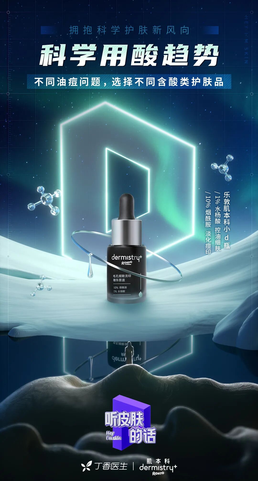比如第三季《听皮肤的话》第七集,就介绍了头皮问题导致的脱发现象背后的原理和科学应对方式。当“秃”成为当下年轻人们最关注、最焦虑的话题,《听皮肤的话》也将“皮肤”的定义拓展至了头皮;而刷酸红遍小红书之后,刷酸也成为《听皮肤的话》新一季的一期,针对不同油痘问题,选择不同酸类科学解决方案。