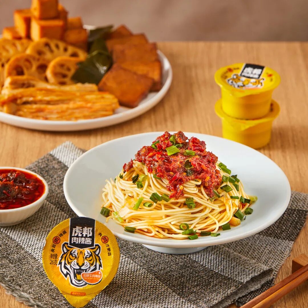 在品牌营销上,虎邦与叶一茜等明星,李佳琦、薇娅等KOL深度合作,通过展示肉辣酱的花式吃法,拓展食用场景,占领用户心智。