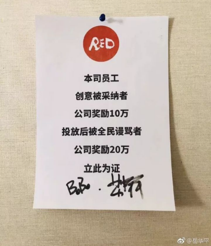 红制作对自己的广告创作逻辑与思路有一种偏执的坚持,不以被骂为羞耻,而是以被更多人骂为荣。网络上曾经流传这样红制作的启事,内容是:本司员工,创意被采纳者,公司奖励10万,投放后被全民谩骂者,公司奖励20万,立此为证。落款是BOBO和岳华平。
