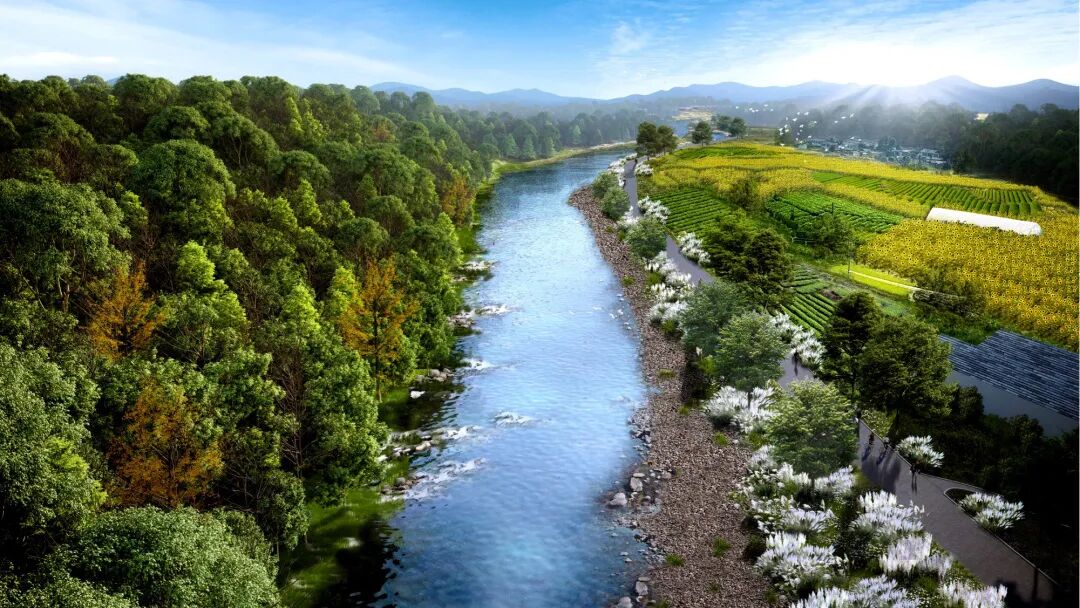 河对岸,云雾缭绕的山脚之下,天府黑茶公园、渡槽记忆林盘、茶乡之秀林盘等美丽乡村项目依次拉开序幕。