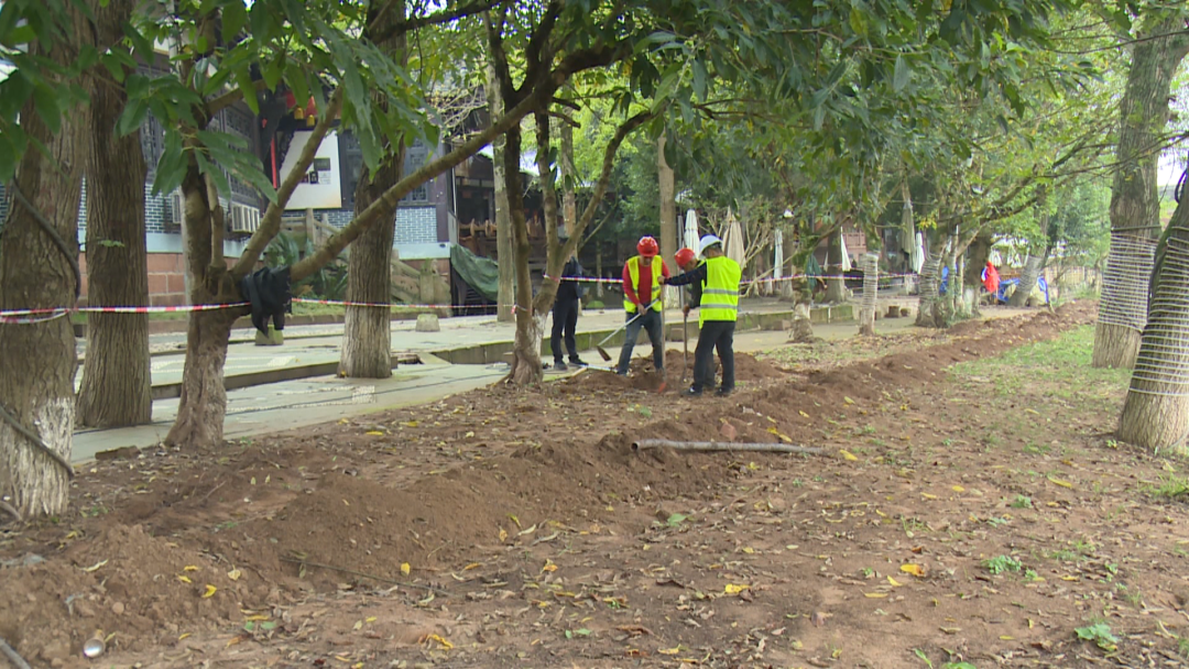 不远处,几名工人正在进行施工,一个小游园开始成型。这是平乐古镇旅游设施整改项目中的一个子项目。