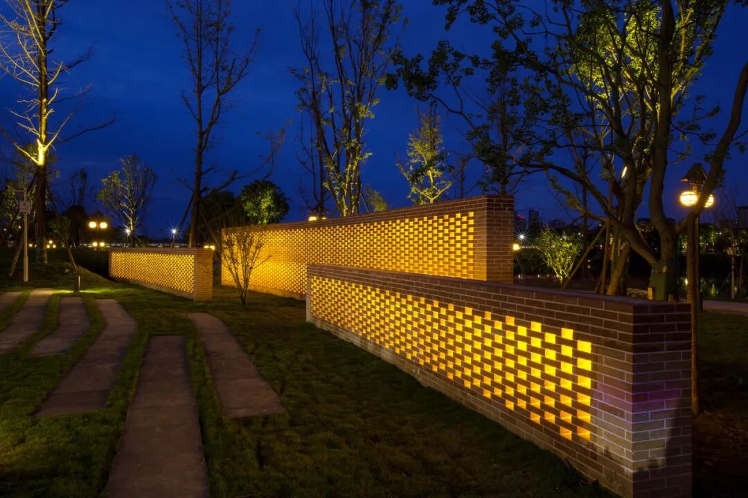 以青砖、红砖作为景墙基底,融入夜间灯光设计,抽象地表达绵延不熄的烧造窑火,体现出邛窑窑烧文化。