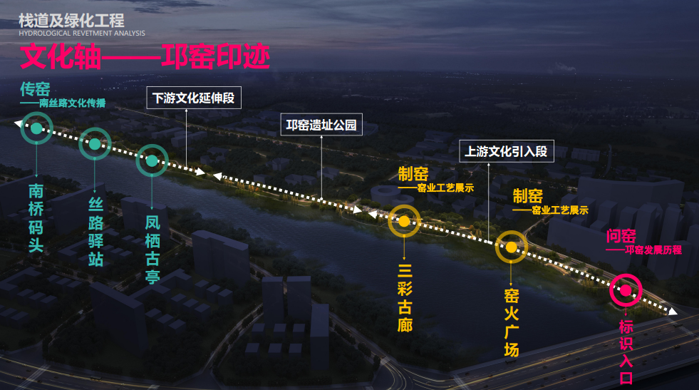 河滨栈道及绿化工程分为上下游两大版块,采用“邛窑印迹、丝路绿洲”的设计理念,讲述历史故事、营造环境氛围、延续场所记忆。