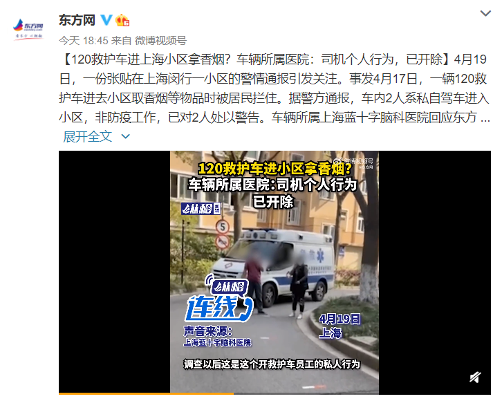 4月19日,记者多方核实,该救护车并非属于上海120系统车辆,属于上海蓝十字脑科医院。