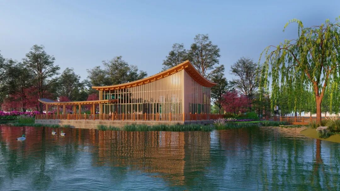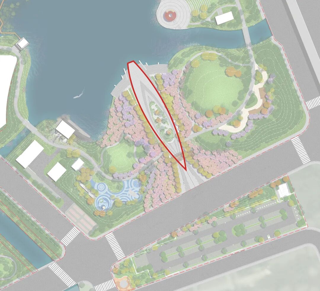 公园入口区域,以罗店龙船形态为设计原型,使得大门如同取景框一样,将公园中轴美景映入眼帘。