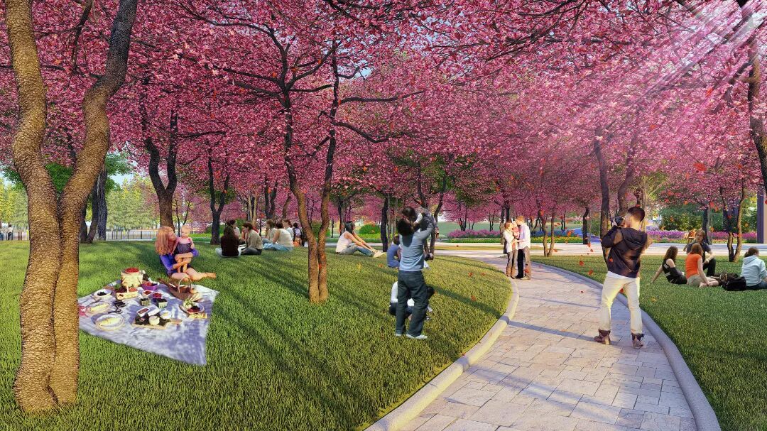 公园入口广场以“春花”为主题,采用早樱、山樱、染井吉野樱等樱花品种,配合海棠等春季开花植物,打造主入口景观。与罗店花神相呼应。
