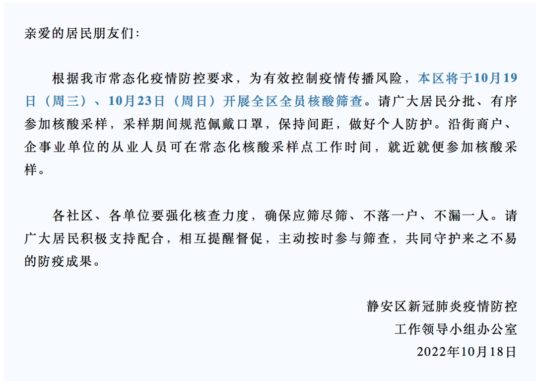 根据本市防疫要求,静安区疫情防控工作领导小组安排,为排查风险隐患,保障人民群众身体健康,北站街道将于10月18日(周二)、10月19日(周三)、10月20日(周四)连续三晚18:00,10月23日(周日)早上8:30开展4次全员核酸筛查。相关事项安排如下: