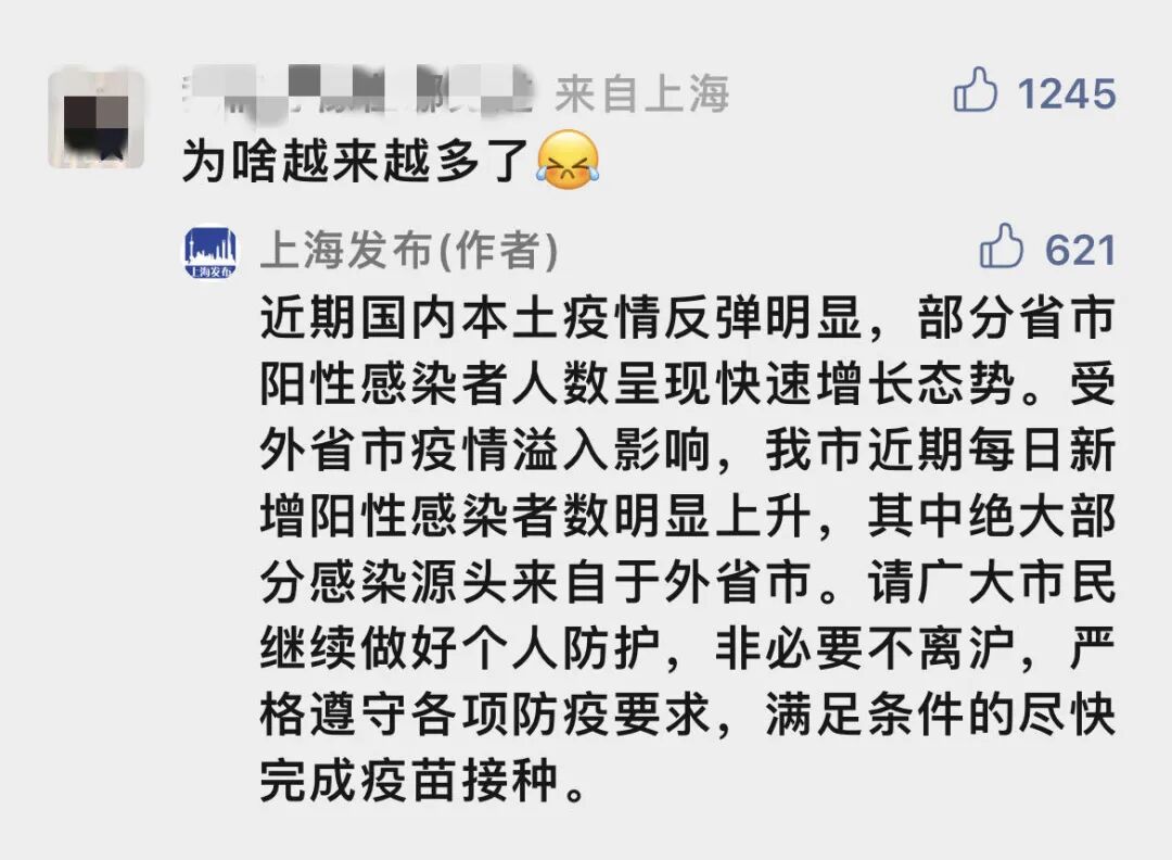 上海发布:近期国内本土疫情反弹明显,部分省市阳性感染者人数呈现快速增长态势。受外省市疫情溢入影响,我市近期每日新增阳性感染者数明显上升,其中绝大部分感染源头来自于外省市。请广大市民继续做好个人防护,非必要不离沪,严格遵守各项防疫要求,满足条件的尽快完成疫苗接种。