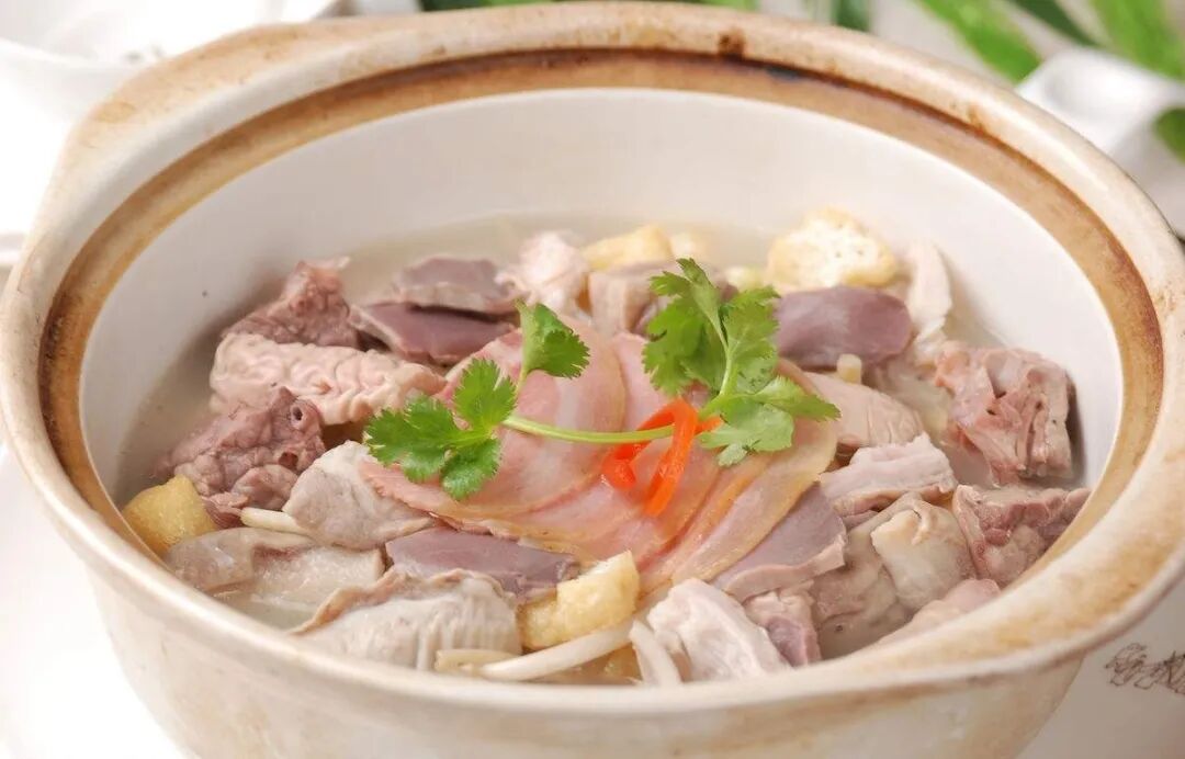 各色的猪耳、脑等内脏放锅里小火慢煨,
