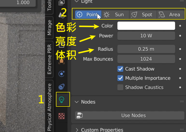 选择想要调整属性的点光源,点击属性栏上的灯光属性(灯泡图标)(1),后续你可以在(2)这里把光源类型换成其他几种(也可以在添加里之间选择种类添加):![]()