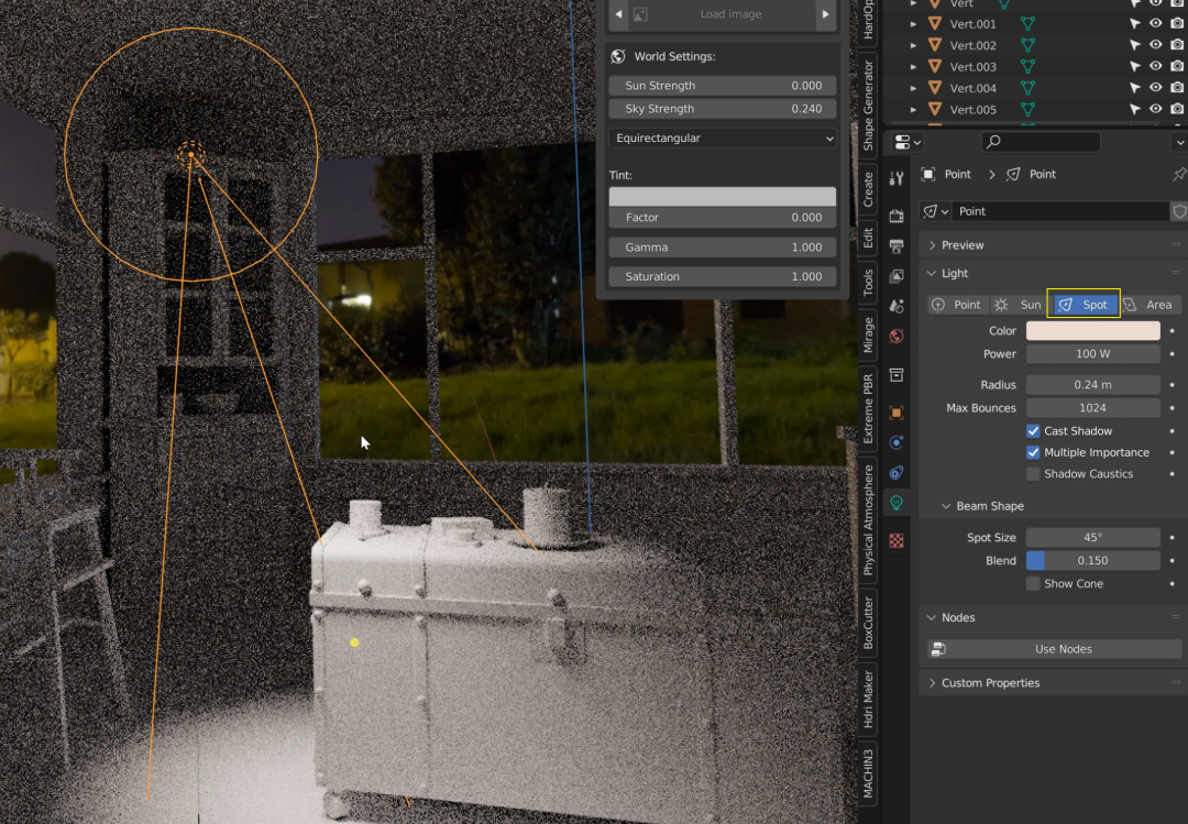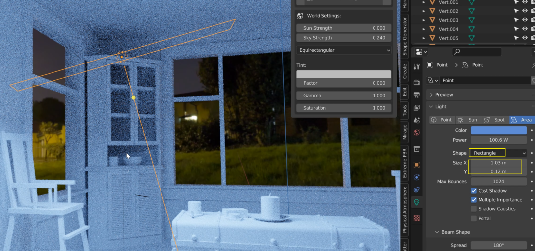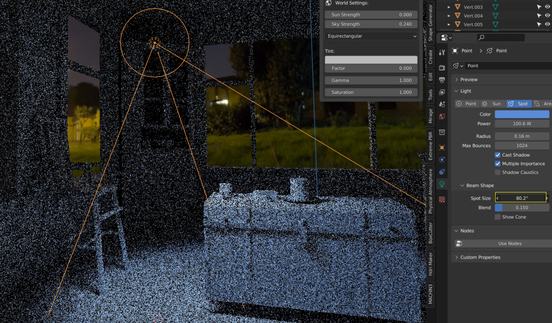 看上图就知道,射灯是用来模仿那些带有方向性的光源的,比如车大灯,舞台射灯等等。你也可以像调整阳光那样调整它的照射角度。![]()