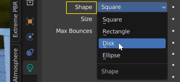 但你可以在 Shape 里选择面光源的形状,有方形、长方形、碟形和椭圆形可选,形状不同会影响到光斑的效果,你们可以试试: