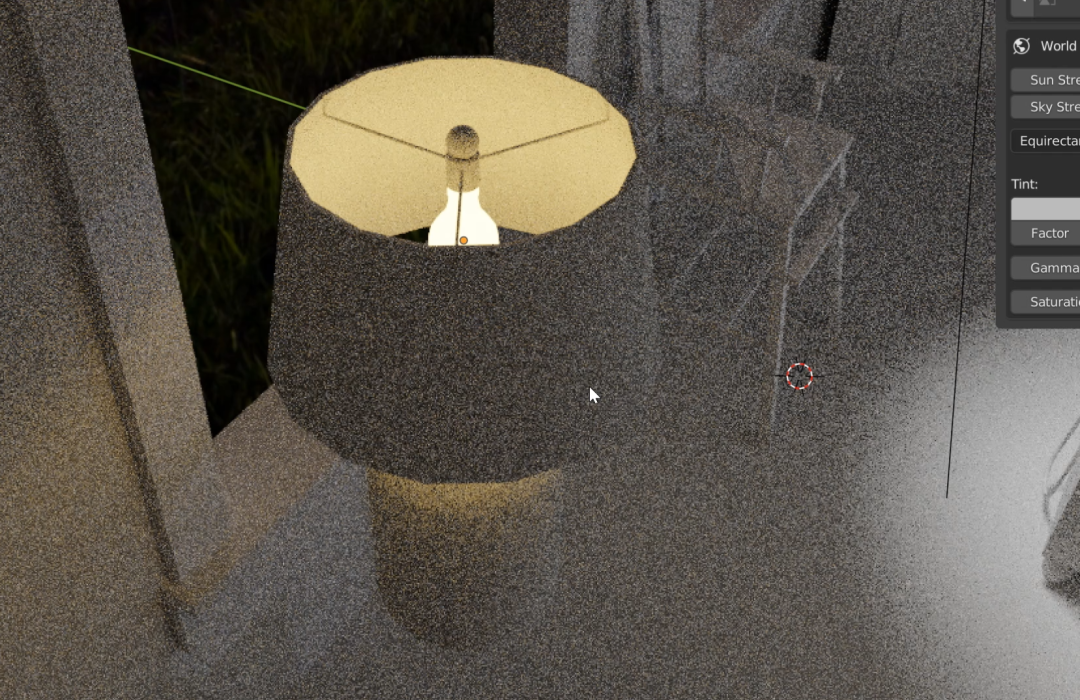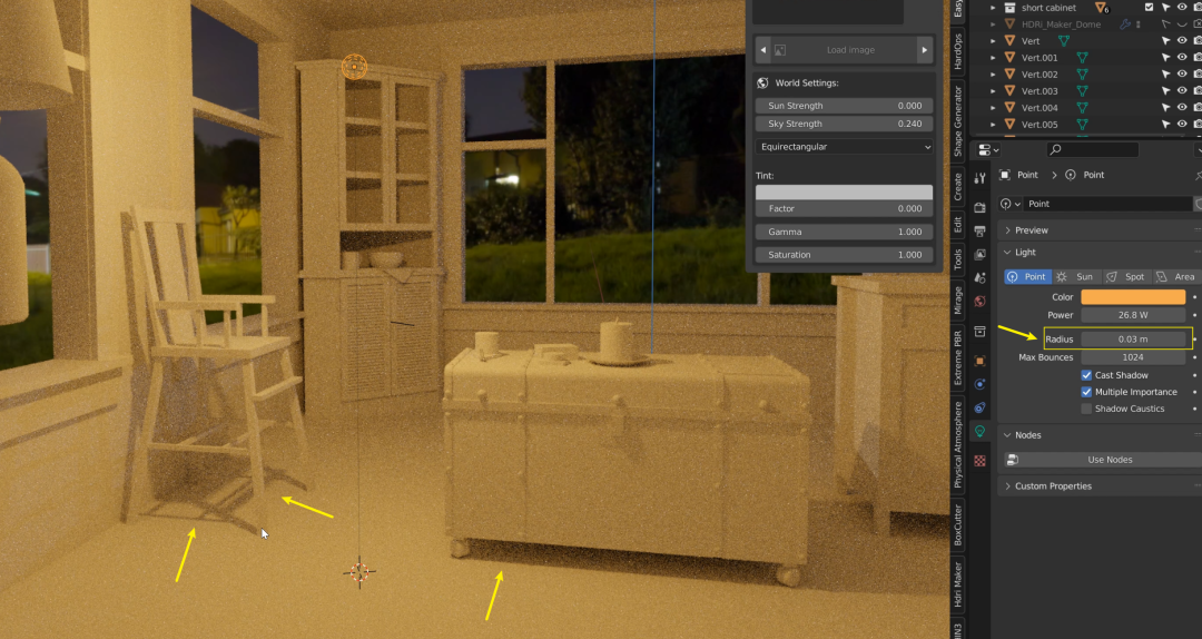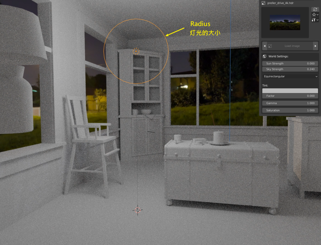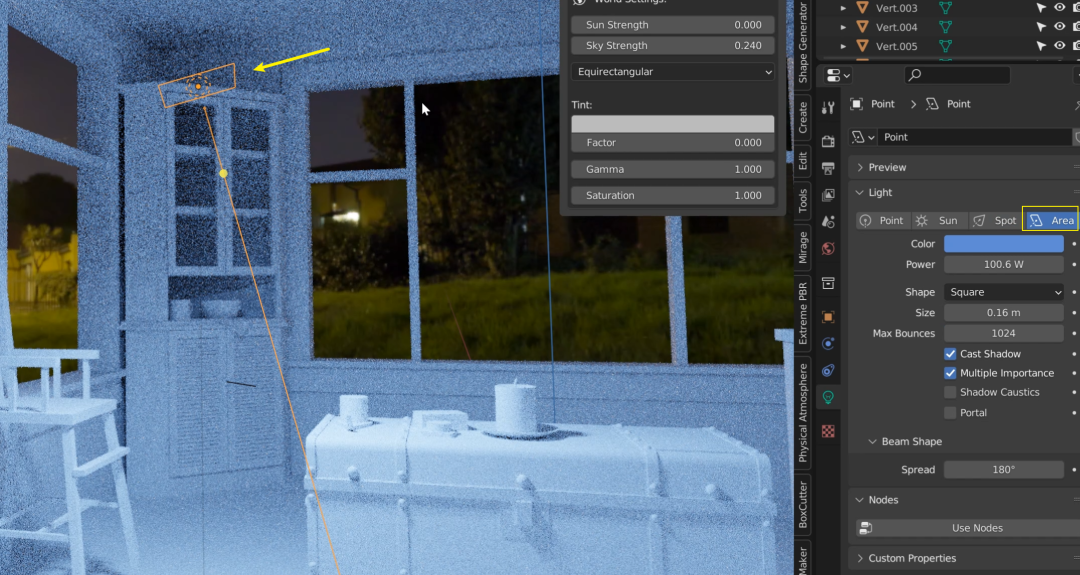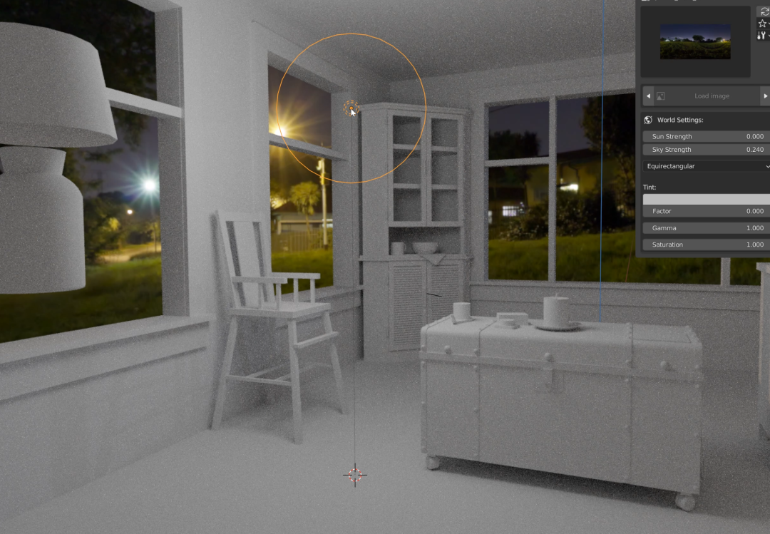 载入了一张树林环绕的 HDRI 贴图,可以看到,从窗外进来的光不止一个颜色,已经模仿得很真实了: