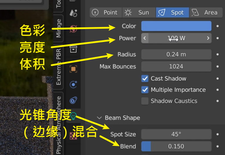 点光源常用的参数是色彩、亮度和体积,色彩亮度就是字面意思。