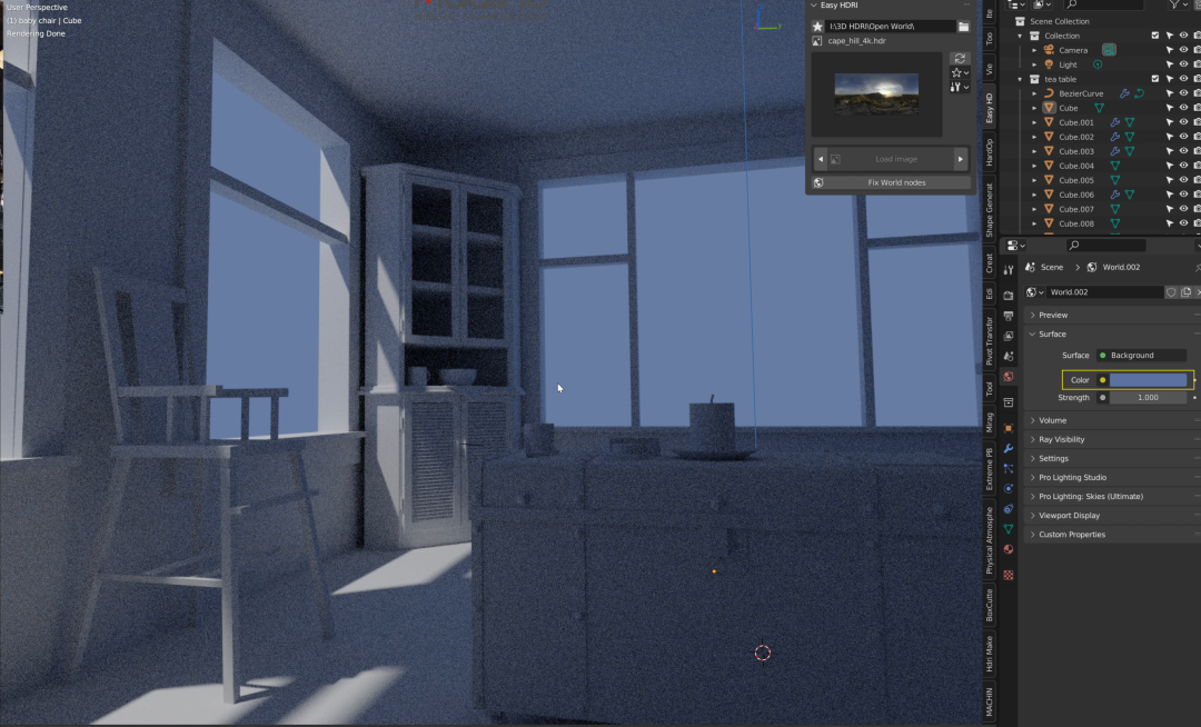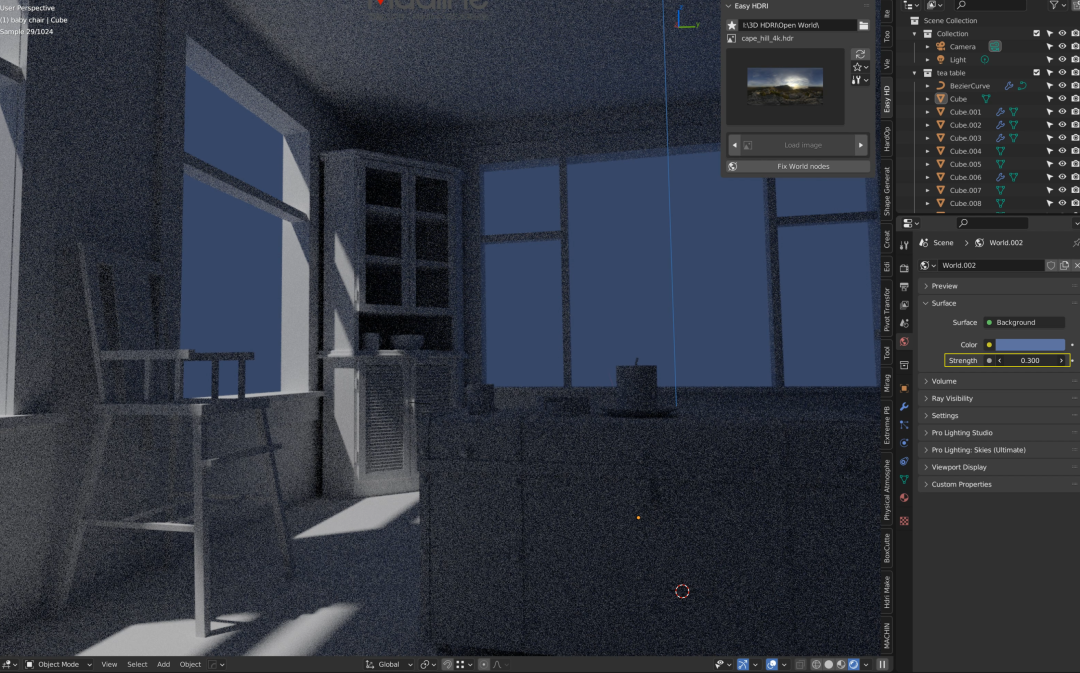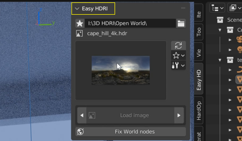 首先,安装下载文件里的 “EasyHDRI-1.0.1 2.8.zip” 插件,安装方法和以前的没区别,记得保存设置,然后你按 N 键打开插件栏,在侧边你就可以找到 Easy HDRI 插件了: