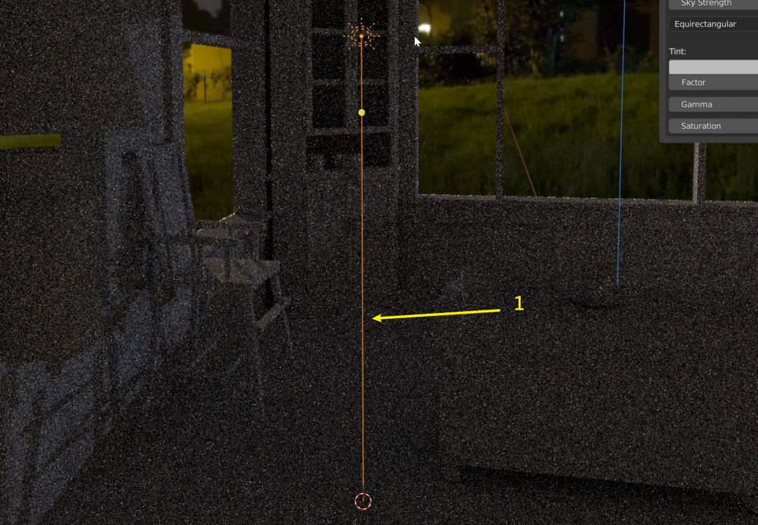 和其他光源不同的是,你无需移动阳光到室外,只要调整阳光的朝向就可以了,下图中的(1)就是太阳照射的方向。你可以选择阳光后,按 R 选择某个轴来改变太阳的照射方向,也可以按 RR 做自由旋转: