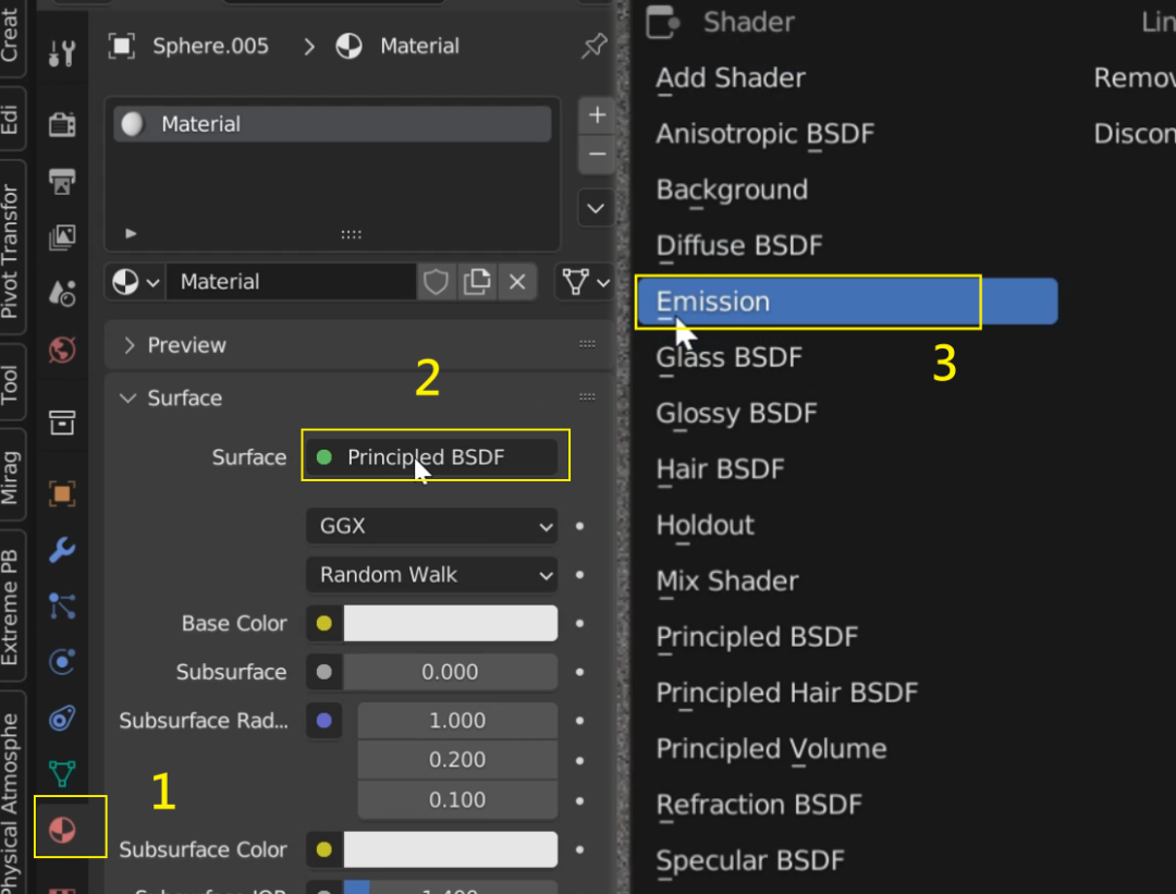 点击(2)更换材质类型,选择 Emission 发光材质(3):