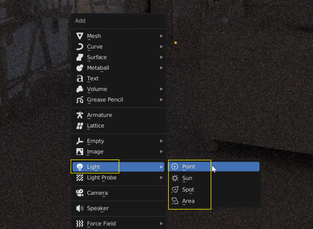 在场景中按 shift+A 添加,选择 Light 灯光,然后选择 Point 点光源:![]()