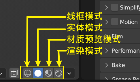 从左到右依次是:线框、实体、材质预览和渲染模式。