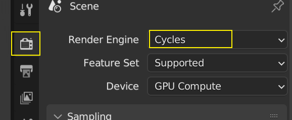 然后,点击属性栏里的渲染属性(相机图标),把渲染引擎改成 Cycles,blender 自带的渲染引擎里只有这个渲染器能计算出准确的光影效果: