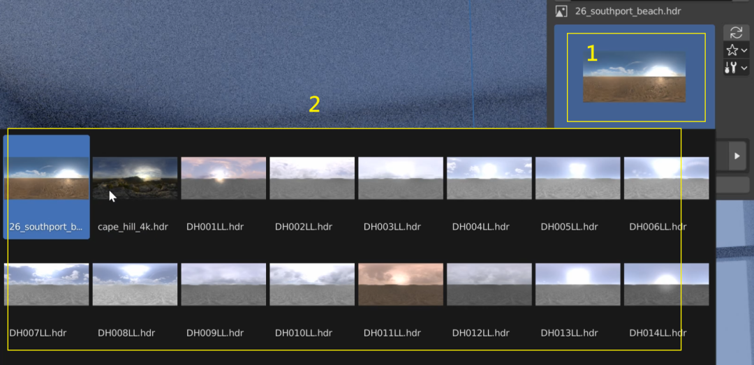 然后点击(1),就会在弹出的窗口里显示该文件夹里所有的 HDRI 贴图,选择一个比较接近你设想的气氛:![]()
