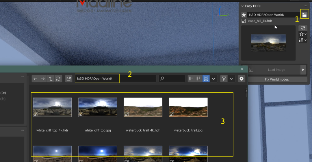 回到 Blender 里,点击 Easy HDRI 插件中的文件夹图标(1),找到你存放 HDRI 贴图的路径(2),然后随意选择一张贴图(3),点下方的 Accept: