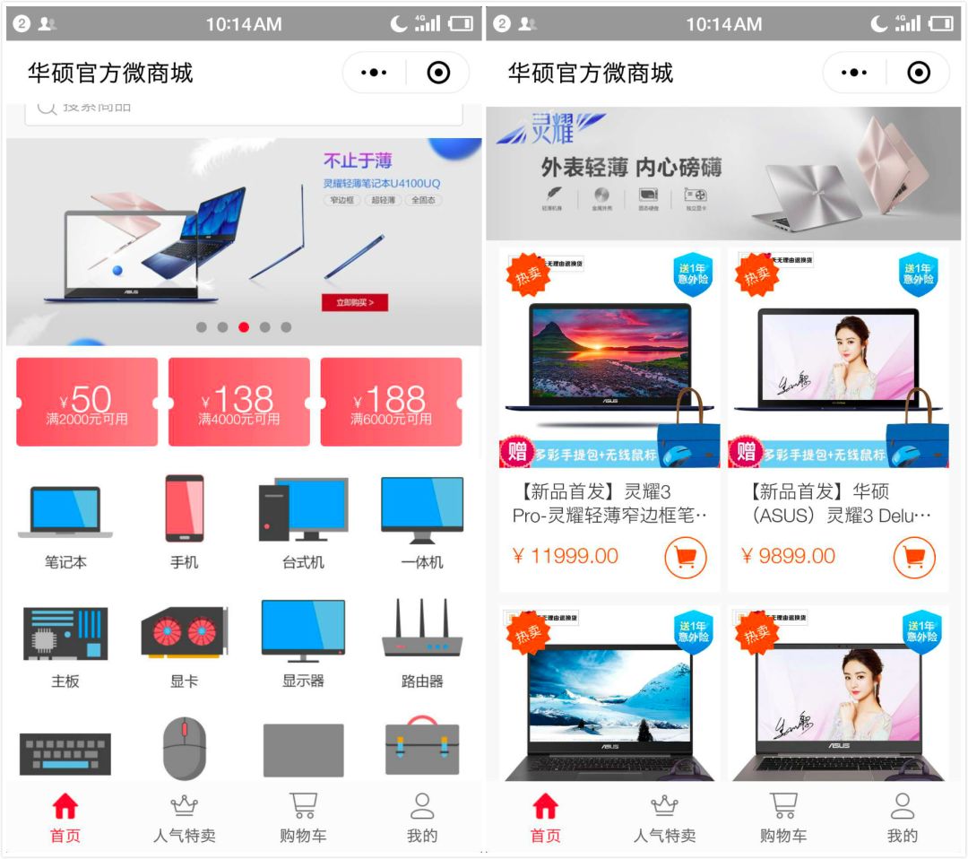 “华硕官方微商城”用有赞小程序的图片广告、优惠券、搜索框、魔方等组件,完整搭建了专属的电商小程序,针对主机、零配件等分类导向明确,购买选择清晰,为用户提供了很好的线上消费体验。