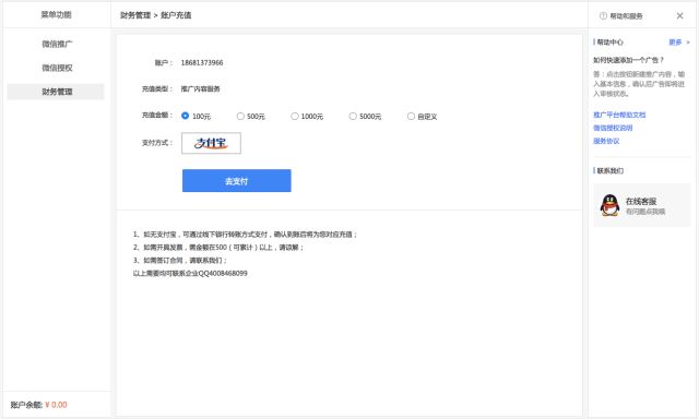 4. 审核通过后,若当前账户没有余额,则需要进行充值后才会进入投放,若当前账户有余额,则立即开始投放,若投放过程中账户余额不足,则会进入暂停,充值后可继续投放。 财务管理里可以随时查看每天的消费情况。