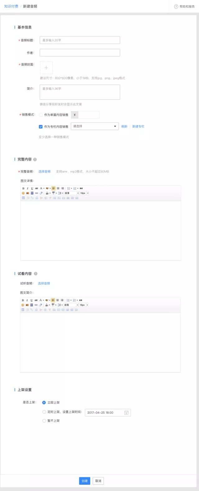 c、[完整音频]是必填项,图文详情(即付费后可看的图文)、试看视频、和图文简介可以根据需要选择性填写;