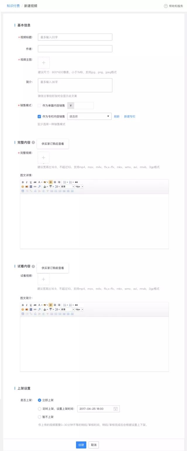 d、[完整视频]是必填项,图文详情(即付费后可看的图文)、试看视频、和图文简介可以根据需要选择性填写;