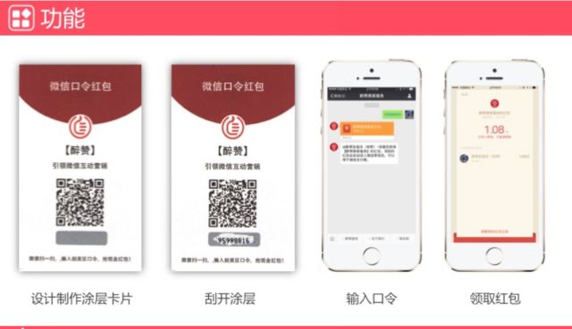 商家可以制作类似上图的微信口令红包卡片,卡片承载二维码、口令、关键词信息,消费者在操作时,可以给公众号输入口令、关键词领取红包,支持兑换记录导出,红包金额可以固定和随机。商家可以将该卡片放在产品购物袋中,在最后一步触达消费者。
