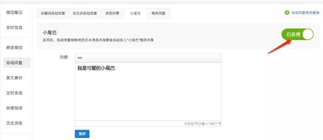 店铺后台 - 营销 - 微信公众号 - 自动回复 - 小尾巴