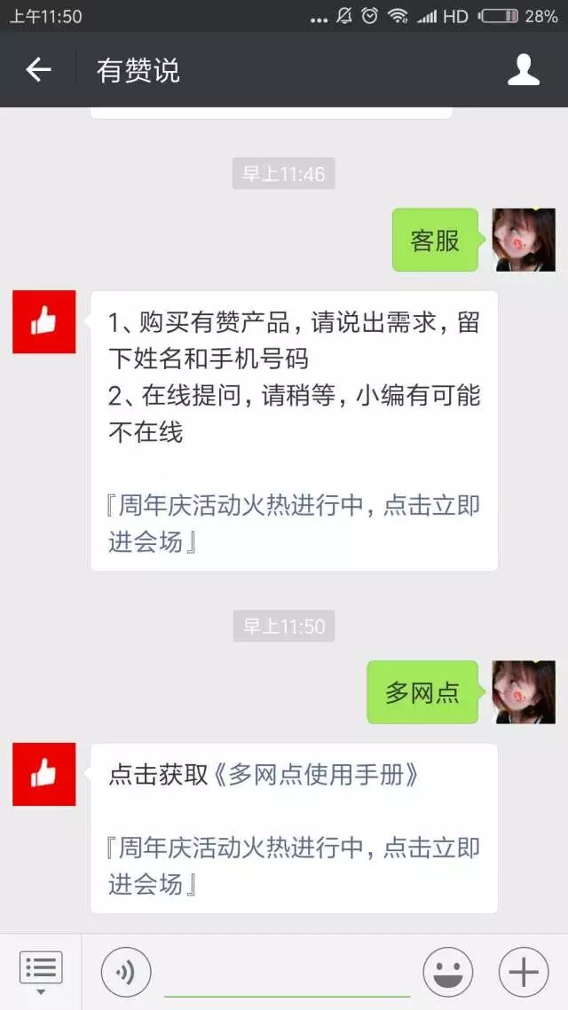 比如A商家最近在举办周年庆,那就可以设置一个“周年庆活动火热进行中,点击立即进会场”的小尾巴,让用户收到的每一个自动回复都能有周年庆活动的通知。