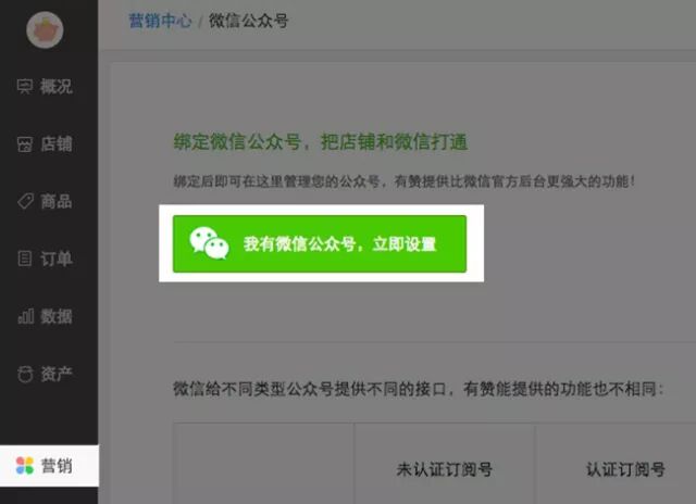 由于以上功能都是有赞微商城后台才能实现的,所以上面的那些功能都需要将微信公众号绑定/授权有赞,也就是把微信公众号(包括非认证和认证)绑定到有赞微商城的微信管理后台。