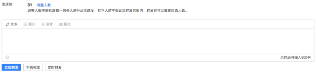 如果商家F要对某个活动做前期的测试,想在一部分里看看效果如何,可以选择1000个粉丝进行此次群发。效果好的话就推送给全部粉丝,不好的的话就在调整活动规则。这个操作就可以通过调整人数来实现。