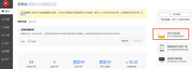 微商城后台概况页右侧的有一个【评价与反馈】调研问卷,我们定期都会整理商家在这里给有赞反馈的需求。