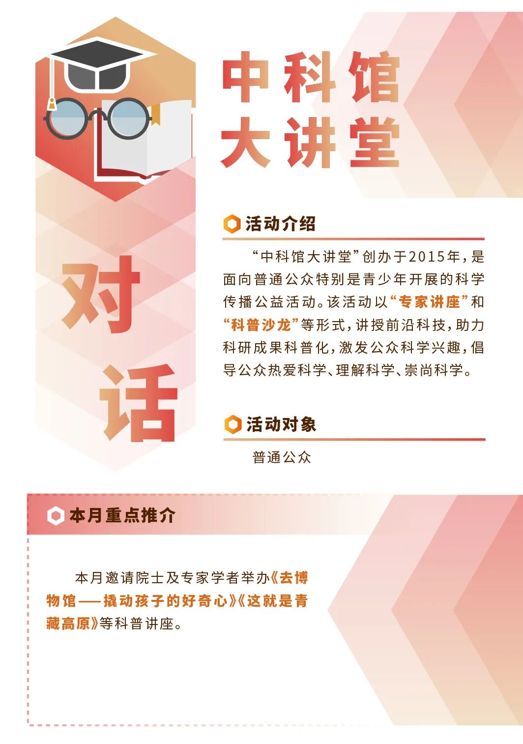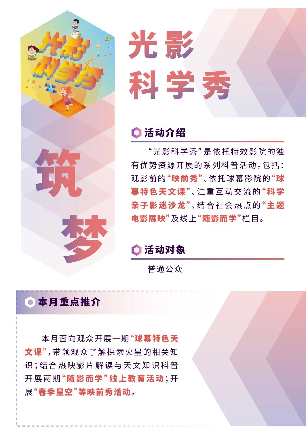 功能介绍 中国科学技术馆是我国唯一的国家级综合性科技馆,是实施科教兴国战略和人才强国战略、提高全民科学素质的大型科普基础设施。主要教育形式为展览教育,同时组织各种科普实践和培训实验活动。