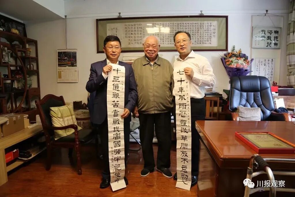 马识途和手执对联的阿来(左)、侯志明(右)合影 。(资料图)