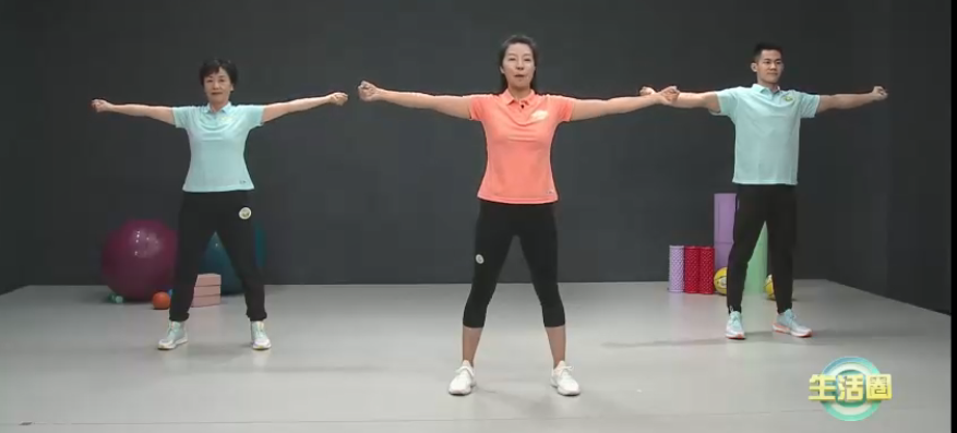 3.加上脚下的步伐,双脚分别向两侧跨步再还原