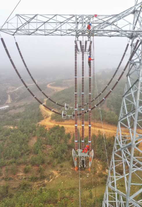 11月14日,白鹤滩—浙江特高压工程线路最后一个架线区段进行高空作业。安伟/摄