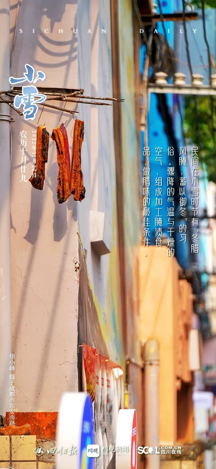 ● 民间在小雪时节都有“冬腊风腌,蓄以御冬”的习俗。骤降的气温与干燥的空气,组成加工腌渍食品、做腊味的最佳条件。在北方很多地区,人们习惯积酸菜、腌咸菜,南方地区则偏爱晒鱼干、做香肠、腌腊肉。将猪肉用食盐、八角、花椒、桂皮等香料腌渍,随之烟熏成腊味醇厚的腊肉保存,等到春节的时候就能吃到风味独特的传统美食。@四川人,你家准备做腊肉香肠了吗?