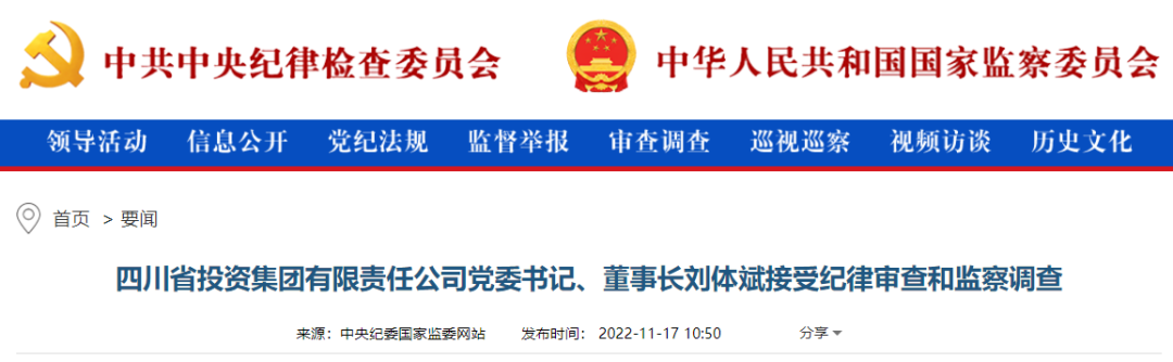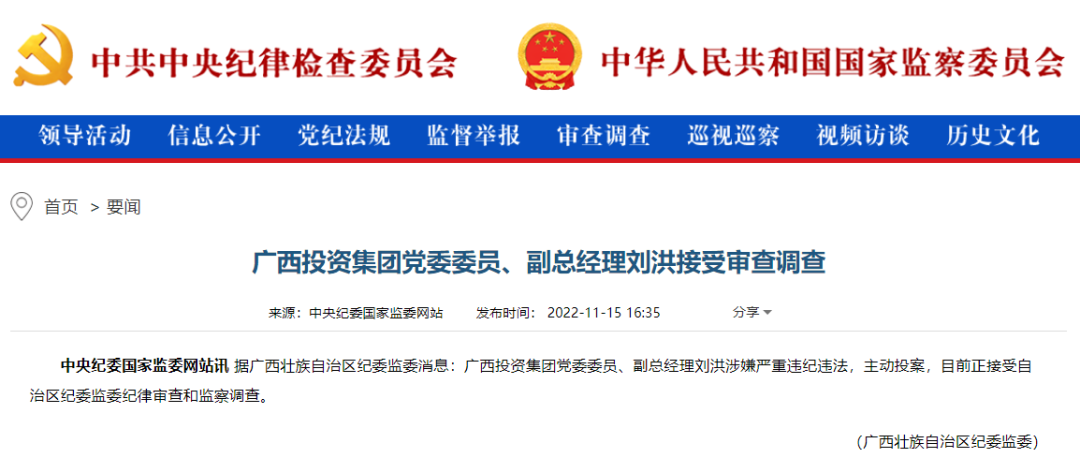11月15日,该网站发布一则“广西投资集团党委委员、副总经理刘洪涉嫌严重违纪违法,主动投案,目前正接受自治区纪委监委纪律审查和监察调查”的消息。